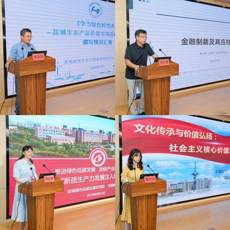 在成果分享环节,盐城黄海湿地生态文明建设研究中心研究员金银亮分享了智库旗舰产品《争当绿色转型典范:盐城生态产品价值实现思路及对策》的撰写思路、基本内容和后期设想;盐城产业经济研究院院长赵永亮分享了主题为《金融制裁及其应对研究》研究报告,从金融制裁概述与特点,制裁对经济金融的冲击及应对制裁的手段与措施进行了详细介绍;盐城绿色低碳发展研究院院长沈晓梅分享了主题为《推进绿色低碳发展 加快产业转型升级》研究报告,从绿色筑基夯实农业新质生产力、绿色赋能引领工业新质生产力和绿色跨越培育生态新质生产力开展了深入分享;江淮人文研究院研究员杨梁杰介绍了智库成果《文化传承与价值弘扬:社会主义核心价值观与盐城故事》的创作过程、心得体会和未来规划。
