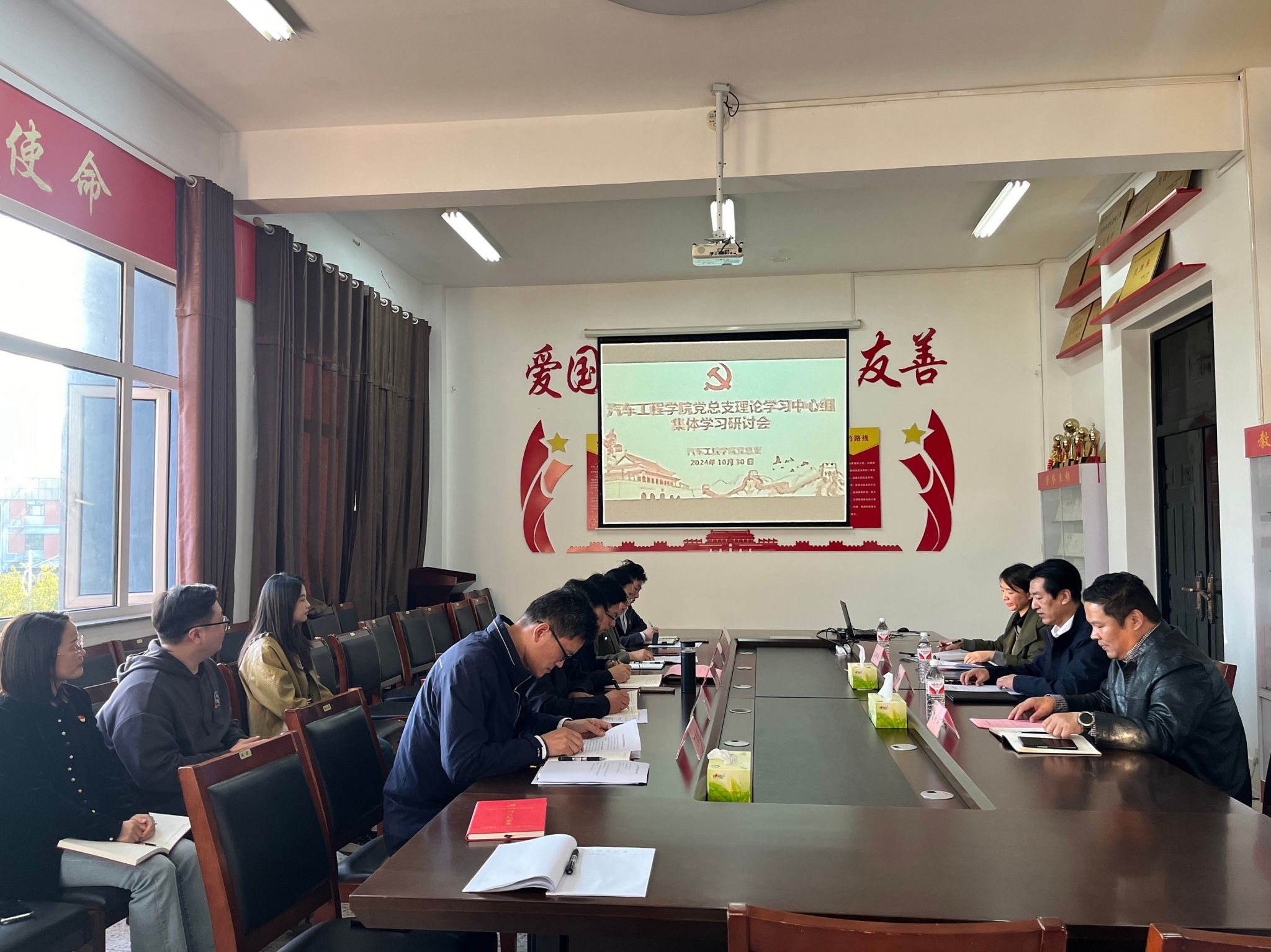 10月30日下午,汽车工程学院党总支理论学习中心组在机械馆A323会议室举行集体学习研讨会,学习研讨习近平总书记关于教育的重要论述、习近平总书记关于党的自我革命的重要思想以及党中央和省委关于应用型本科高校建设的决策部署。校党委第四巡学旁听组组长、党委常委、副校长王资生,校党委第四巡学旁听组成员、后勤基建处副处长郁步军,校党委第四巡学旁听组秘书孙明珠旁听指导。汽车工程学院党总支书记陈青主持,汽车工程学院党总支理论学习中心组全体成员参加。