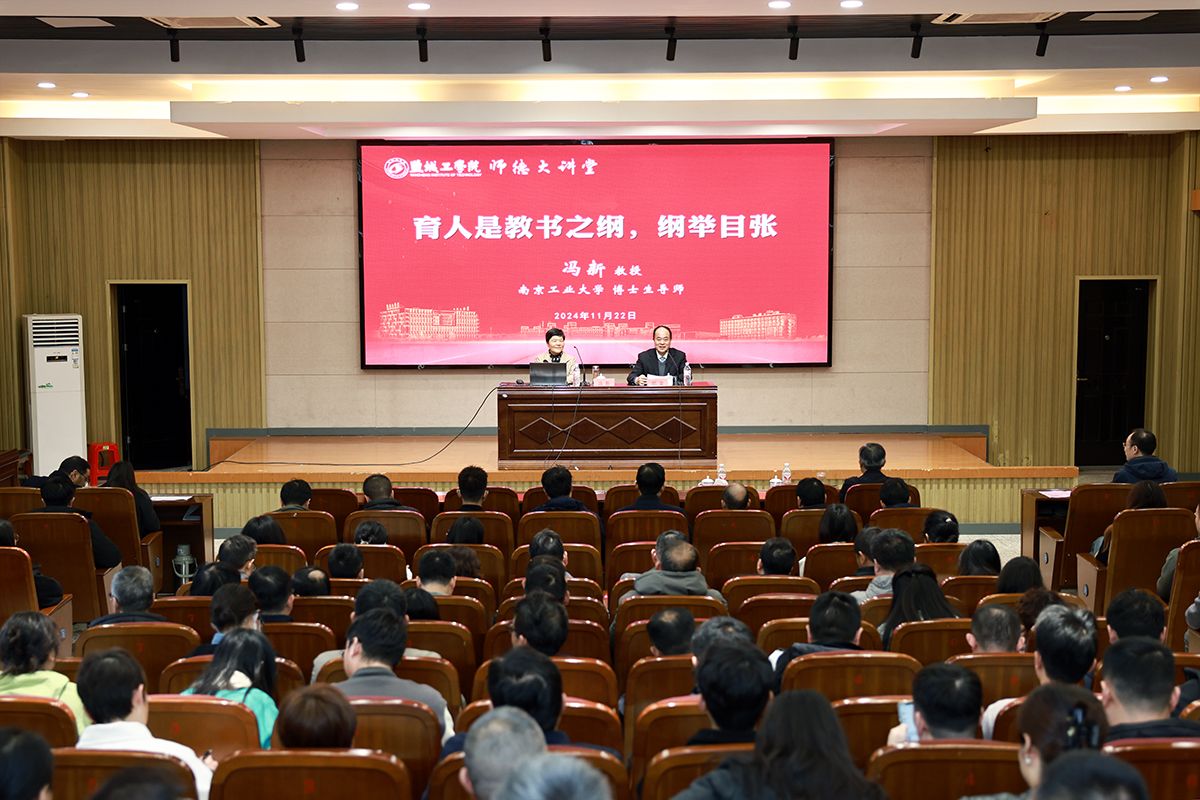 11月22日下午,在希望大道校区机械馆报告厅,“感动江苏教育人物——2018最美高校教师”、庆祝中华人民共和国成立70周年纪念章获得者、江苏省高校优秀共产党员、南京工业大学“师德楷模”、南京工业大学“师德十佳”冯新教授应邀作客我校师德大讲堂,作题为《育人是教书之纲,纲举目张》的主题报告。校长、党委副书记邵荣主持报告会。各二级学院党政负责人、教科研办公室主任、专业系主任、课程组组长、实验中心主任、教师代表及2023年新入职教师等近300人聆听报告。