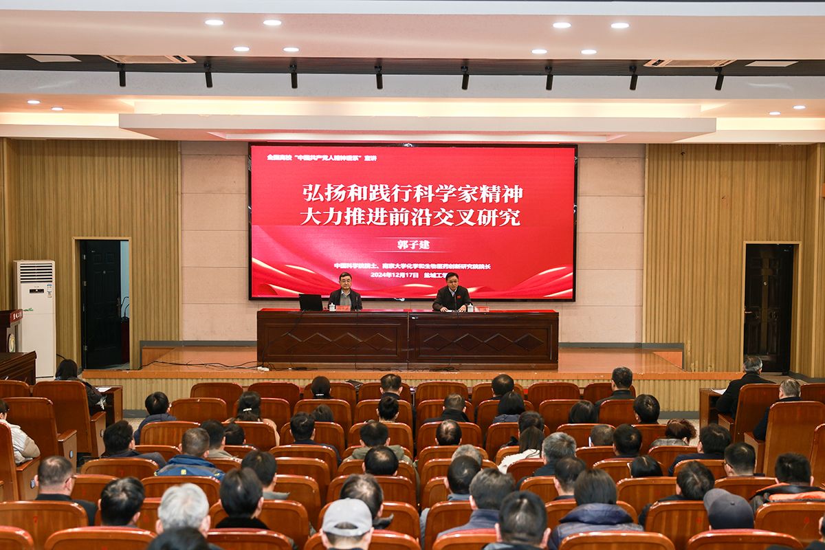 12月17日下午,在希望大道校区机械馆报告厅,全国高校“中国共产党人精神谱系”宣讲团专家、中国科学院院士、南京大学郭子建教授应邀来校作题为“弘扬和践行科学家精神,大力推进前沿交叉学科建设”专题报告。校党委副书记薛浩主持,党委常委、宣传部部长奚新国,相关职能部门主要负责人,各二级学院党政主要负责人,具有博士学位、副高以上职称教师代表等300余人参加。
