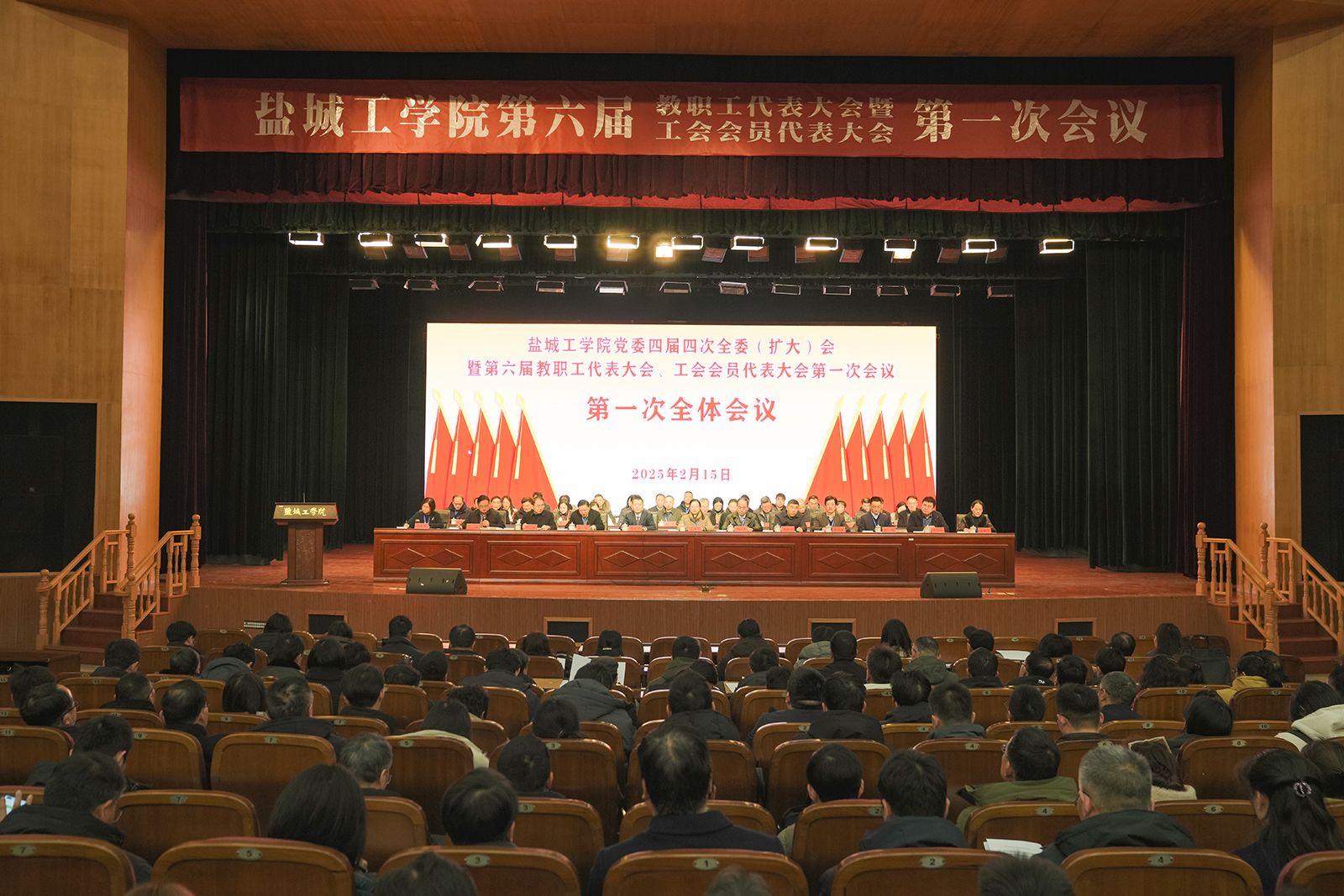 2月15日,学校在希望大道校区行政楼报告厅召开党委四届四次全委(扩大)会暨第六届教职工代表大会、工会会员代表大会第一次会议。校党委书记方海林,党委副书记、校长邵荣,盐城市总工会副主席周小进,盐城市教育局四级调研员、教育工会常务主任吴恒广,校党委副书记薛浩,党委常委、副校长王资生,副校长、盐城市政协副主席丁成,党委常委、副校长王伟,党委常委、纪委书记、省监委派驻盐城工学院监察专员陈伟,党委常委、副校长张勤芳,党委常委、副校长、组织部部长邢晓平和驻盐兄弟高校工会主席出席会议。薛浩主持会议。我校党委常委,党委委员、纪委委员,第六届教代会暨工代会代表、列席人员,其他科级以上干部、专业系主任、课程组主任、实验中心主任及科研业务机构内设单位主任以及离退休人员代表等400余人参加会议。