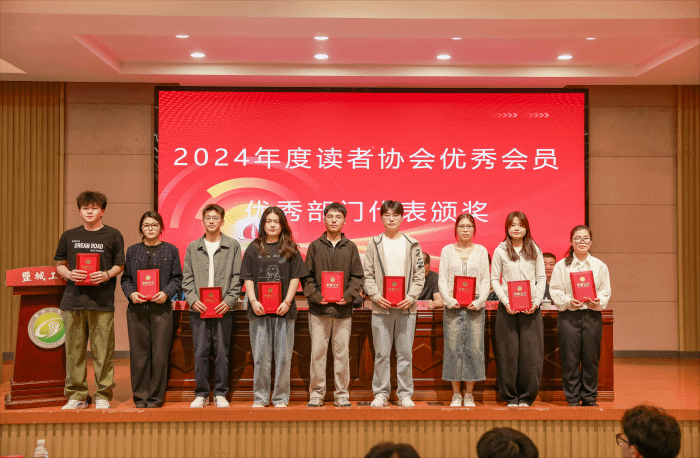 启动仪式上,丁成等为2024年度阅读之星代表、读者协会优秀会员及优秀部门代表颁发荣誉证书。学生处处长杨汉华号召师生读者养成“爱读书、读好书、善读书”的良好习惯。图书馆馆长李明宣读盐城工学院2025年度校园阅读推广系列活动通知,就活动安排主题、活动形式、品牌特色等进行了介绍。学生代表分角色合诵《墨卷生香》,通过《诗经》《楚辞》《理想国》等中西经典文本的声韵交织,以墨香为舟、文字为桨,演绎千年文明的精神图谱。