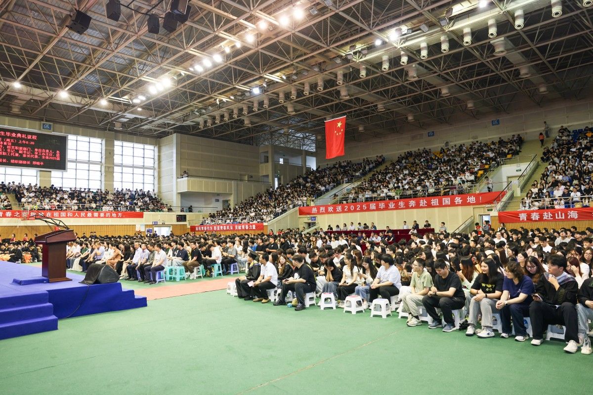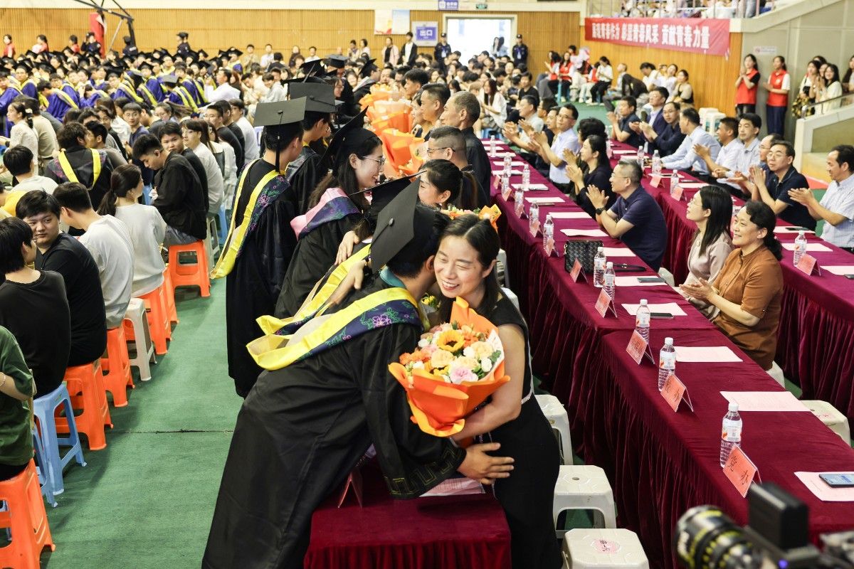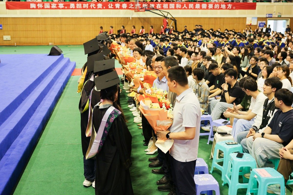 毕业典礼现场,“展现青春作为,彰显青春风采,贡献青春力量”“青春赴山海,赤心报家国,追梦向未来”“立大志、明大德、成大才、担大任,努力成为堪当民族复兴重任的时代新人”“胸怀国家事,勇担时代责,让青春之花绽放在祖国和人民最需要的地方”等励志横幅格外醒目,这些饱含深情的寄语,既是对毕业生成长成才的充分肯定,更是对他们勇担时代使命的殷切期许。学校始终秉持“文化育人”理念,通过文化浸润实现以文化人、以文育人,引导青年学子胸怀“国之大者”,永葆赤子初心,在服务国家发展的伟大实践中放飞青春梦想,让青春之花绽放在祖国和人民最需要的地方。