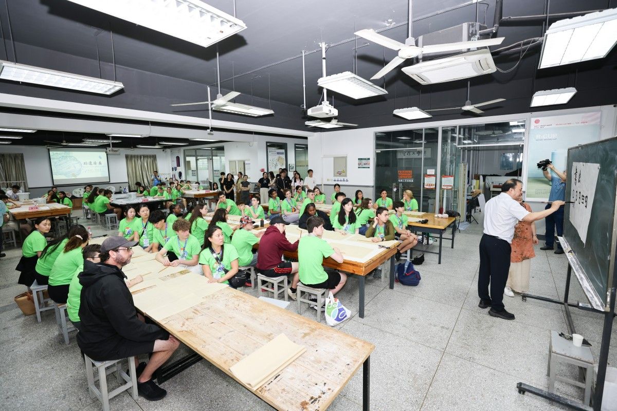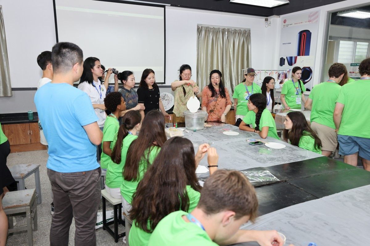 之后,美国师生们来到我校设计艺术学院。在这里,他们体验了我国非物质文化遗产漆扇的制作工艺。现场美国师生们在我校专业老师的指导下,开启了漆扇制作之旅,挑扇面、选漆料、晕染、晾干,每一步都浸透着对中华传统文化的传承与敬畏。此外,他们还体验了我国传统书法,了解了中国书法的历史,认识了笔、墨、纸、砚文房四宝,写下了他们最爱的中国字。
