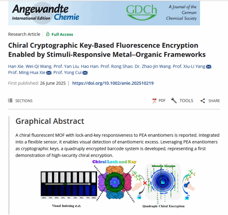 近日,我校解明华、杨秀丽教授课题组在国际化学学科顶尖期刊《Angewandte Chemie International Editon》上发表题为“Chiral Cryptographic Key-Based Fluorescence Encryption Enabled by Stimuli-Responsive Metal-Organic Frameworks”的研究成果(Angew. Chem. Int. Ed. 2025, e202510219)。杨秀丽教授、解明华教授及上海交通大学崔勇教授为论文共同通讯作者,我校2022级研究生谢晗为论文第一作者。这是我校首次以教师为通讯作者、自主培养的研究生为第一作者,盐城工学院为第一通讯单位在《Angewandte Chemie International Editon》期刊发表研究论文。《Angewandte Chemie International Edition》由Wiley出版社1962年创办,是国际化学领域最具影响力的顶级学术期刊之一,致力于报道化学学科各个领域的原创性、突破性成果,以其卓越的学术质量和广泛的国际影响力而著称,2024-2025最新影响因子为16.9。