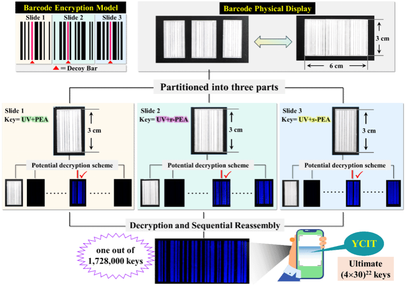 在此基础上,创新发展了手性二维码加密新策略。该策略利用不同材料的手性荧光响应为加密手段,依赖合理的密钥选择以及正确的条码组合排布,借助智能手机扫码,方可输出正确加密信息“YCIT”。综合利用二维码的条带特征,通过材料填充、条码分割、机械重组等方式全面提升其安全性,将信息泄露的概率降低至约200万分之一。该论文成果首次实现了基于“锁钥”原理的手性分子识别,系统展示了手性MOFs信息加密技术的设计策略方法,对于分子计算机研发及国防保密技术升级具有重要意义。