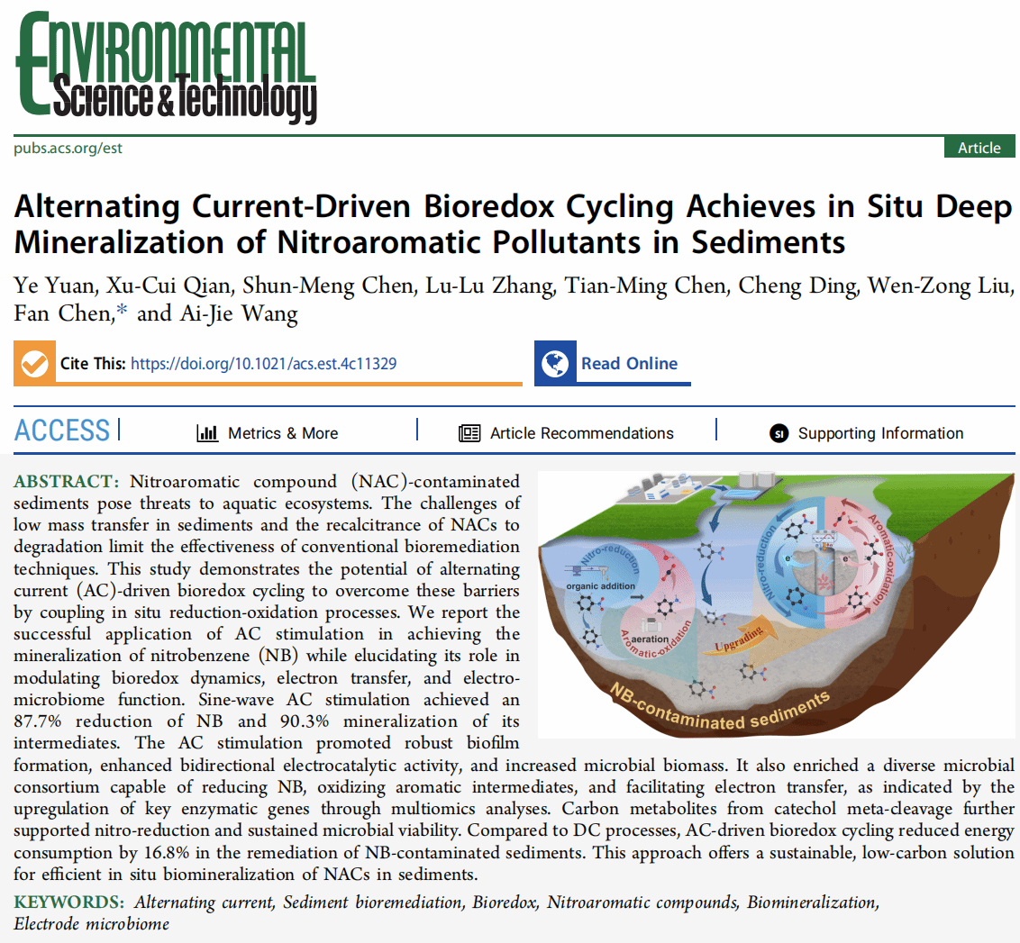 近日,我校远野副教授课题组在国际环境领域的顶级期刊《Environmental Science & Technology》(ES&T)上发表题为“Alternating Current-Driven Bioredox Cycling Achieves in Situ Deep Mineralization of Nitroaromatic Pollutants in Sediments”的研究成果(Environ. Sci. Technol. 2025, 59, 14497–14507)。远野副教授为第一作者,校外兼职硕士生导师、西北工业大学陈帆副教授为通讯作者,2023级研究生钱徐翠为第二作者。这是我校首次以第一单位在ES&T发表研究论文。ES&T创刊于1967年,由ACS出版,是国际环境领域最具影响力的顶级学术期刊之一,致力于报道环境科学与技术原创性、突破性的研究成果,以其卓越的学术质量和广泛的国际影响力而著称,2024-2025最新影响因子为11.3。