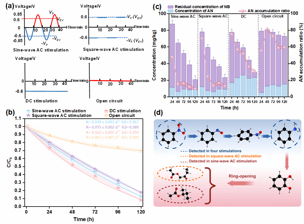 研究团队构建了生物电化学底泥修复系统,对比研究了正弦波AC、方波AC、直流电(DC)及开路(OC)四种模式下的硝基苯(NB)去除效能和降解机制。采用宏基因组-转录组联合分析技术,结合非靶向代谢组学和电化学表征手段,系统解析了AC刺激下微生物群落结构演变、功能基因表达及代谢网络重构规律。研究表明,正弦波AC电刺激显著强化了NB的去除与深度矿化,在实现87.7%去除率的同时,中间产物矿化率高达90.3%,明显优于DC与方波AC等模式。相比DC刺激虽能高效去除NB但易导致中间产物积累、矿化受限,正弦波AC不仅显著增强电极电化学活性,还有效降低体系内阻,提升电子传递效率,推动反应更高效进行。