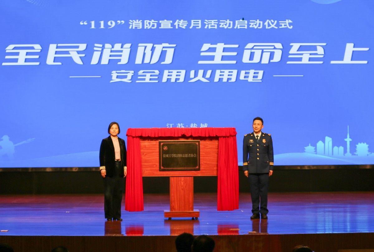 邢晓平和丁俊标为“盐城工学院消防志愿者协会”揭牌