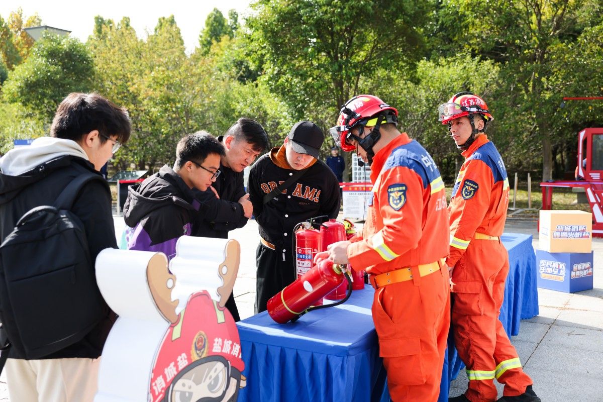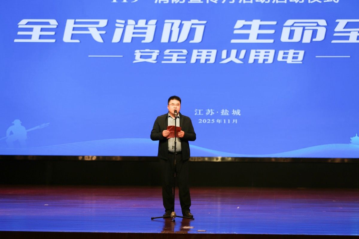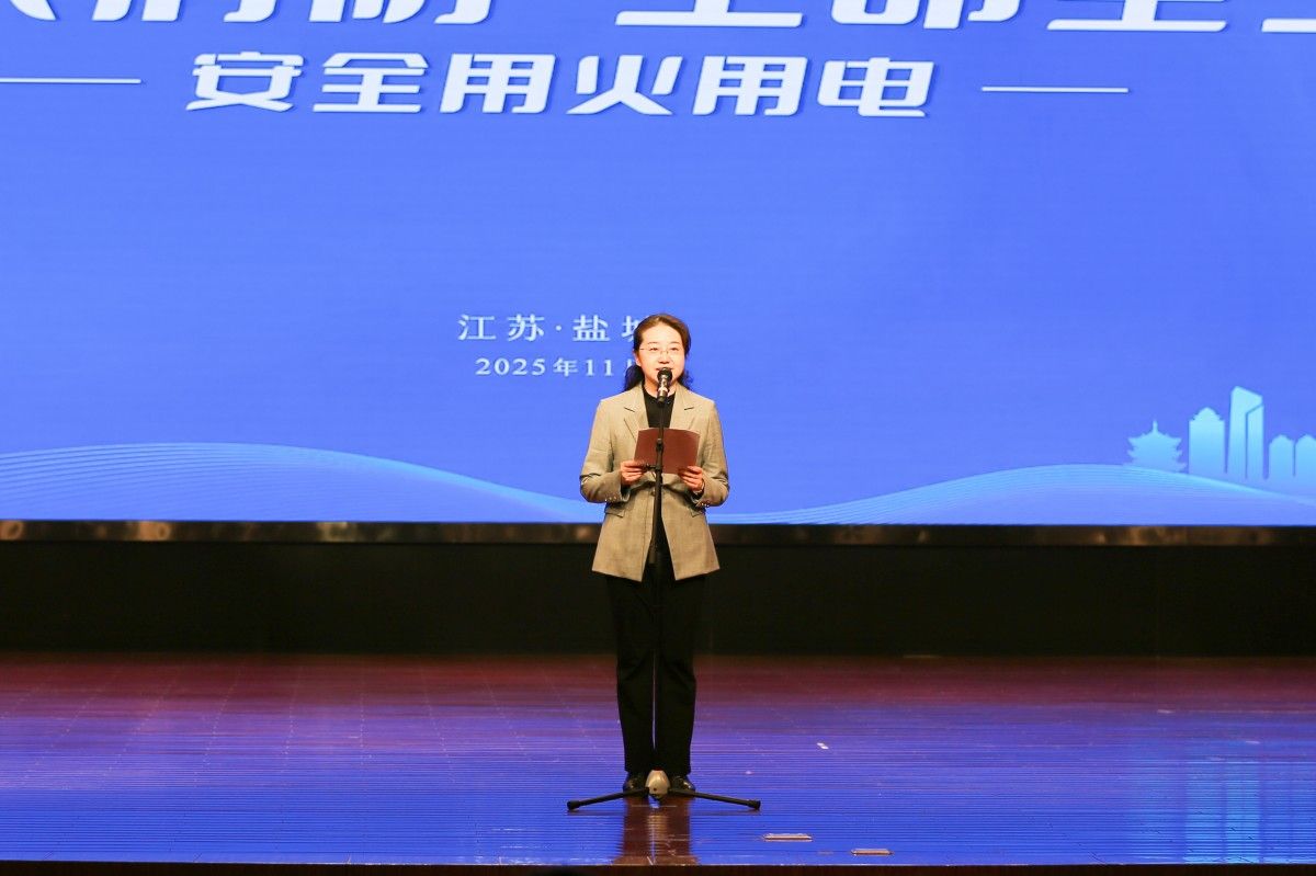 张勤芳代表学校致辞。他指出,学校党委、行政始终将消防安全摆在突出位置,把保障校园消防安全、守护好师生的生命财产安全作为首要责任和不可动摇的底线要求。2025年盐城市“119”消防宣传月活动启动仪式在我校举行,既是市委、市政府对我校消防安全工作的信任与肯定,更是一份沉甸甸的责任与鞭策,此次活动为学校提供了一次极为宝贵的学习机会和提升契机。他表示,学校将以此次活动为新的起点,紧紧围绕“安全用火用电”这一重点,在全校范围内掀起消防安全宣传教育的热潮,教育引导广大师生增强消防意识、掌握消防常识,规范用火用电行为,自觉排查身边隐患,全面提升自防自救能力,让“人人讲安全、事事为安全、时时想安全、处处要安全”的理念内化于心、外化于行,努力实现“教育一个学生,带动一个家庭,影响整个社会”的良好效应。