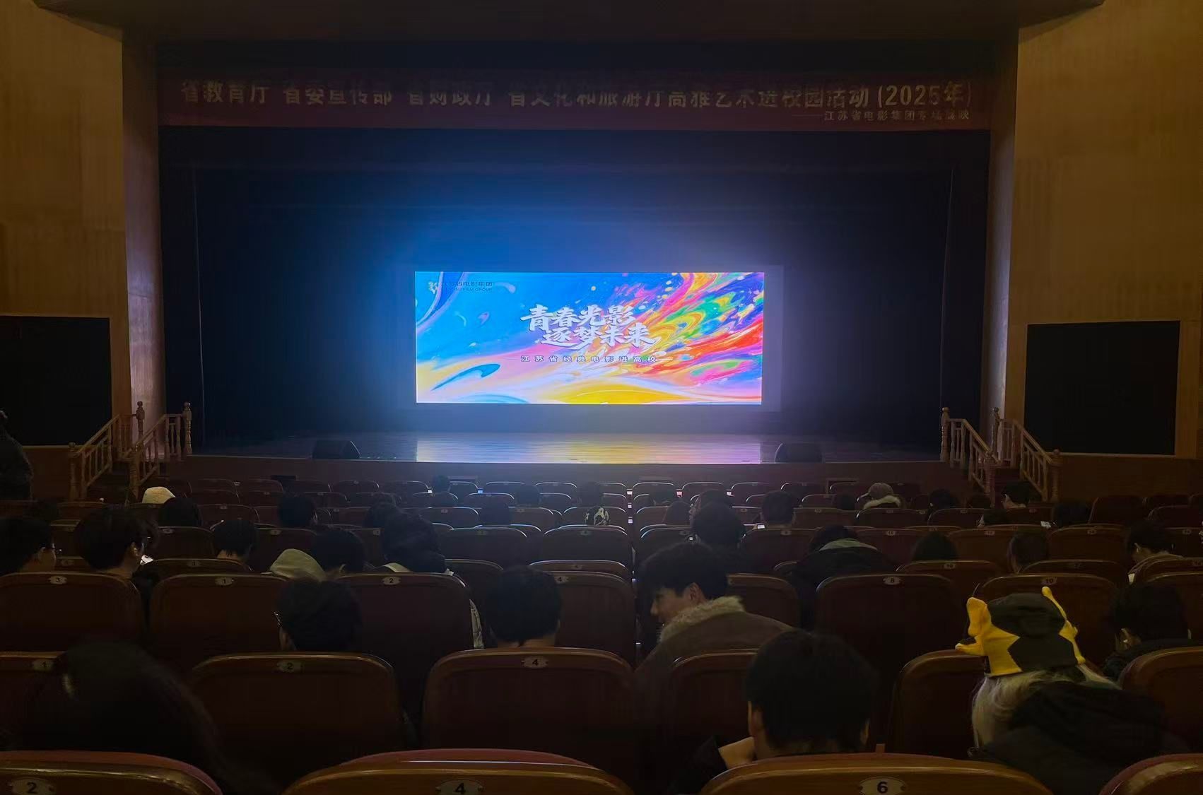 为深入推进美育浸润工作,丰富师生精神文化生活,11月29日,由省教育厅、省委宣传部、省财政厅、省文化和旅游厅共同主办的2025年江苏省高雅艺术进校园活动之江苏省电影集团专场展映,在我校希望大道校区行政楼报告厅举行。校团委精心统筹协调,组织900余名师生共同观看《八角笼中》《逆行人生》两部优质影片,让师生在光影艺术中感受精神力量。