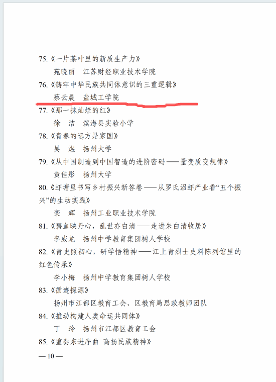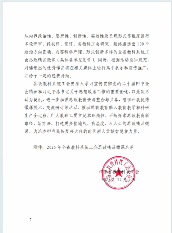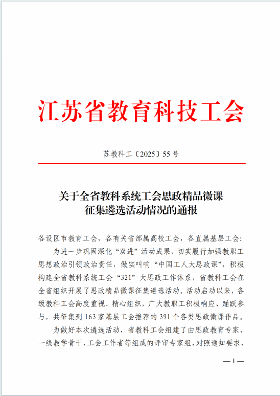 近日,江苏省教育科技工会公布2025年全省教科系统工会思政精品微课征集遴选结果(苏教科2025[55]号),我校马克思主义学院蔡云晨老师的微课作品《铸牢中华民族共同体意识的三重逻辑》成功入选。