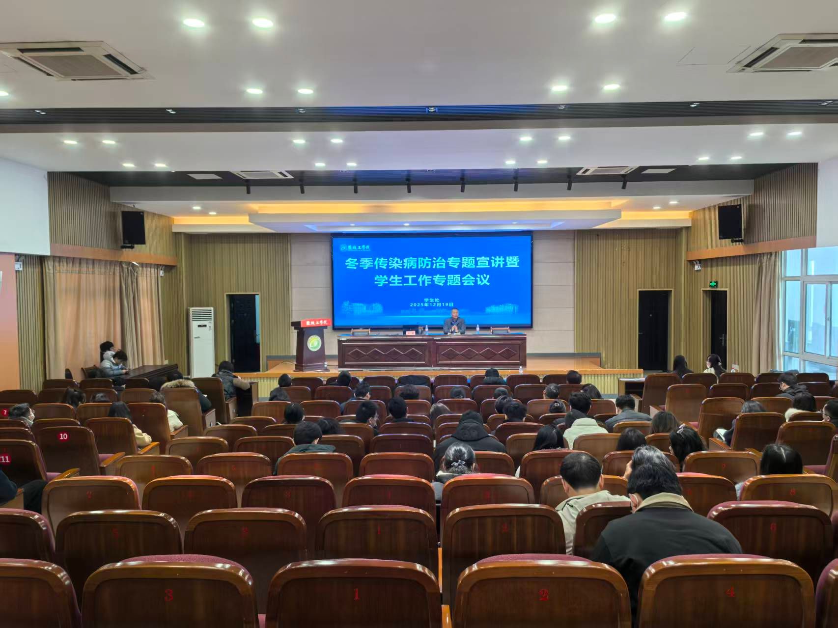 12月19日上午,在希望大道校区机械馆报告厅,学校召开冬季传染病防治专题宣讲暨学生工作专题会议。学生处处长杨汉华主持。学生处、研究生院相关负责人,二级学院分管学生工作书记,学工办(副)主任、团委(副)书记,希望大道校区全体专兼职辅导员参加。