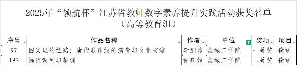 近日,2025年“领航杯”江苏省教师数字素养提升实践活动比赛结果正式公布。我校设计艺术学院李细珍老师、汽车学院许莉娟老师凭借扎实的教学功底、创新的教学设计及娴熟的信息技术应用能力,在众多参赛选手中脱颖而出,分别斩获一等奖、二等奖,充分彰显了我校在教师数字素养培育方面的显著成效。