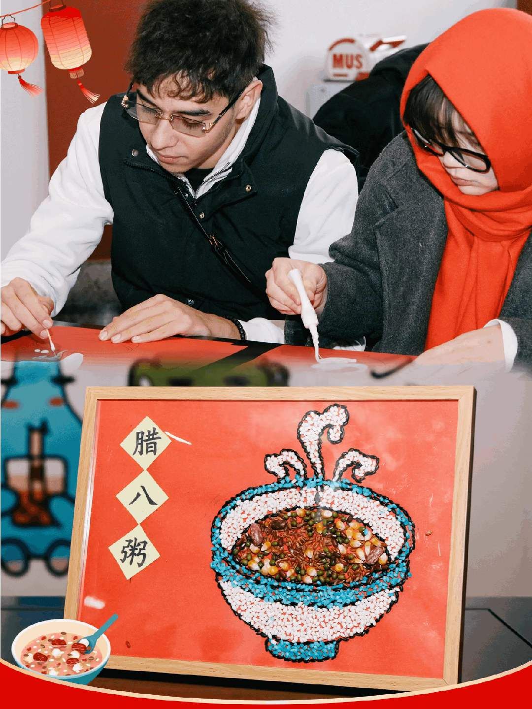 活动中,留学生在讲解员的引导下有序参观各个展厅,透过一件件珍贵文物,领略中华历史之美与古人智慧。在非遗展演中心,大家聆听了关于腊八节起源与习俗的介绍,随后兴致勃勃地投入到腊八手工画的制作中。在老师的指导下,留学生们巧妙运用小米、红豆、绿豆等多种谷物,精心粘贴、自由创作。一幅幅色彩丰富、寓意吉祥的手工作品在大家手中逐渐呈现,现场气氛温馨而活跃。