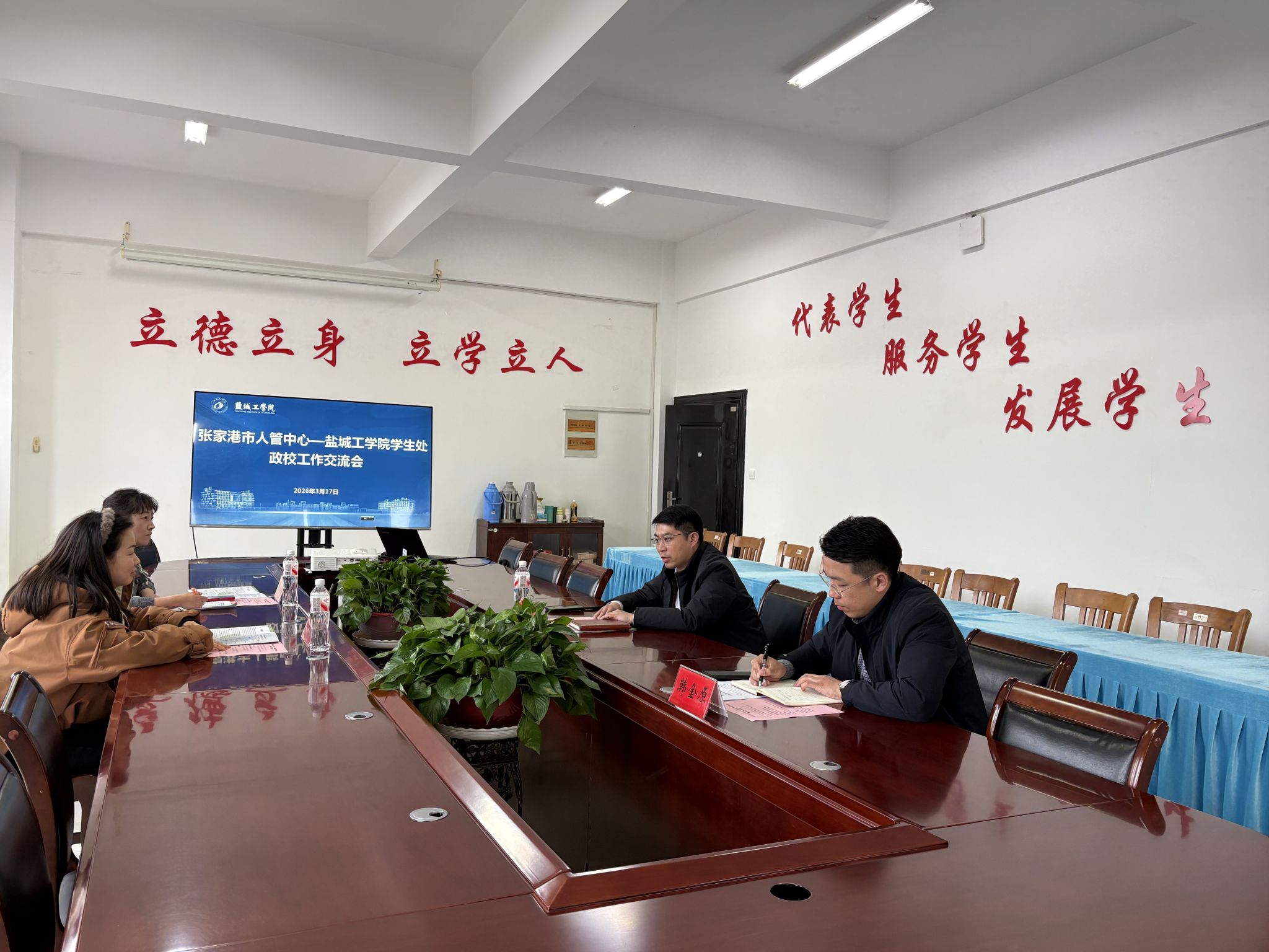 为深化校地协同合作,聚力服务区域经济高质量发展,扎实推进2026届毕业生就业工作,3月17日下午,张家港市人力资源管理服务中心主任科员黄悦柠、张家港市人力资源开发有限公司副经理陈永梅一行到我校学生处开展校地工作交流并举办校园招聘活动。学生处副处长、招生与就业创业指导处副处长阳韬热情接待,就业创业指导中心主任韩金原参加活动。