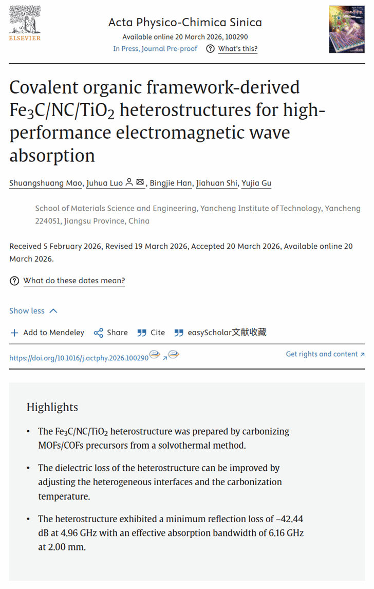 近日,材料学院研究生毛双双在罗驹华教授的指导下,在《Acta Physico-Chimica Sinica》(2026: 100290)上以第一作者身份,盐城工学院为第一单位发表了题为“Covalent organic framework-derived Fe3C/NC/TiO2 heterostructures for high-performance electromagnetic wave absorption”的研究论文,文章链接:https://doi.org/10.1016/j.actphy.2026.100290。该期刊为SCI一区TOP期刊,影响因子:13.7,该论文是材料学院研究生高质量培养的又一次重要体现。
