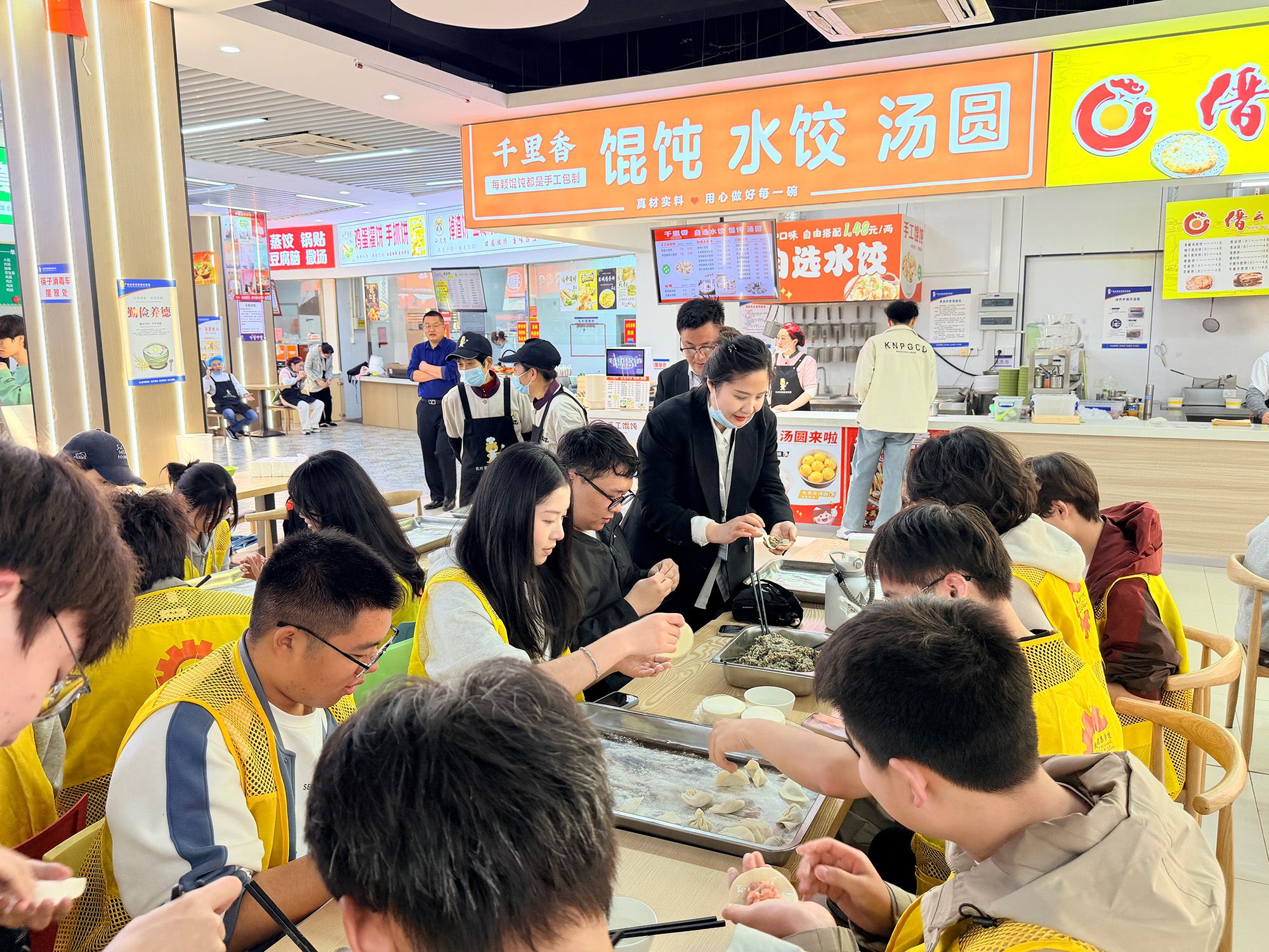座谈交流环节,来自海洋与生物工程学院、机械工程学院、经济与管理学院的学生代表积极建言献策,就食堂运营管理、菜品优化提升、服务质量改善等提出建设性意见建议,集团及饮服中心认真听取记录,后续将逐项梳理、督促整改。座谈会后,组织学生代表实地参观食堂后厨,重点查看原材料采购验收、储存保管、粗加工、烹饪制作、餐具消毒、食品留样等关键环节,详细了解食品安全管控流程与标准化操作规范。在互动联谊环节,学生代表与食堂工作人员共同开展包水饺活动,在互动交流中增进理解、凝聚共识。