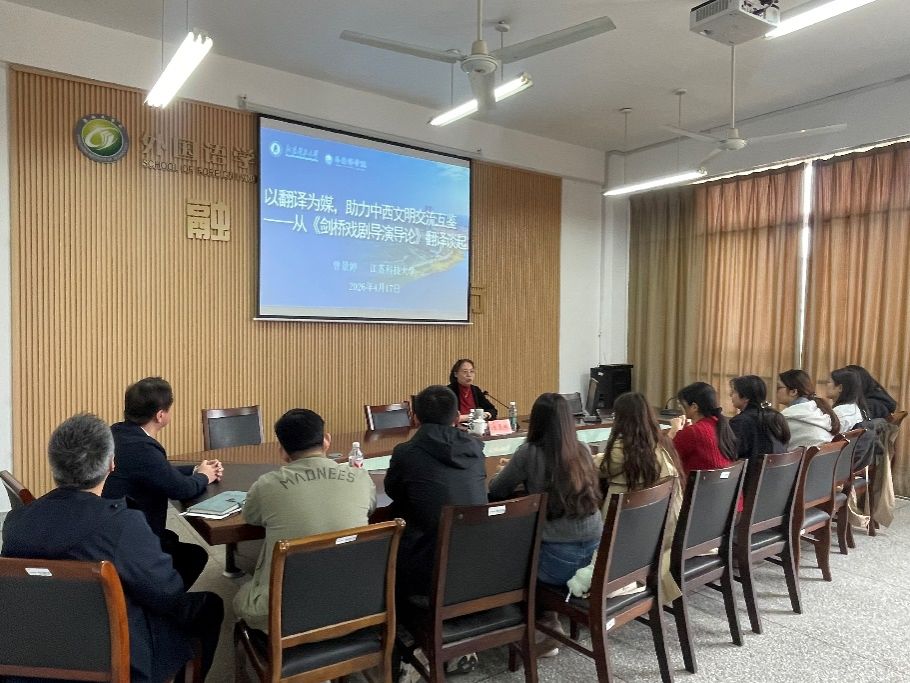 为深入推进翻译学科建设,提升翻译硕士培养质量,4月17日,外国语学院特邀江苏科技大学外国语学院院长曾景婷教授来校,为翻译硕士专业师生作学术报告。院长叶磊主持报告会,副院长周学恒、教师代表及2025级全体翻译硕士研究生参加。