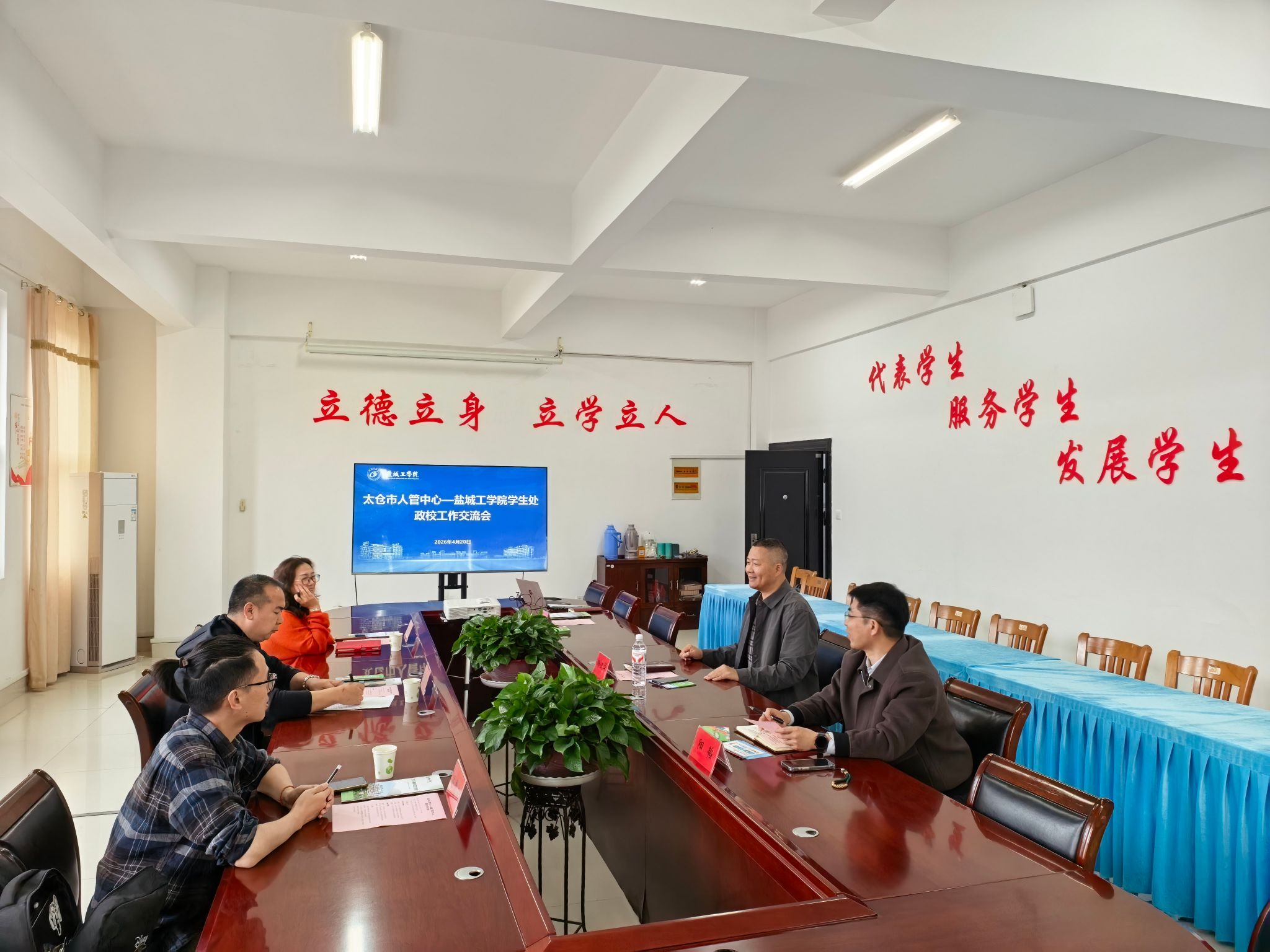 4月20日下午,太仓市人力资源管理服务中心副主任(主持工作)齐雪峰一行来我校调研交流,同步开展校园专场招聘活动。学生处处长杨汉华主持座谈会,副处长阳韬、相关科室负责同志参加。