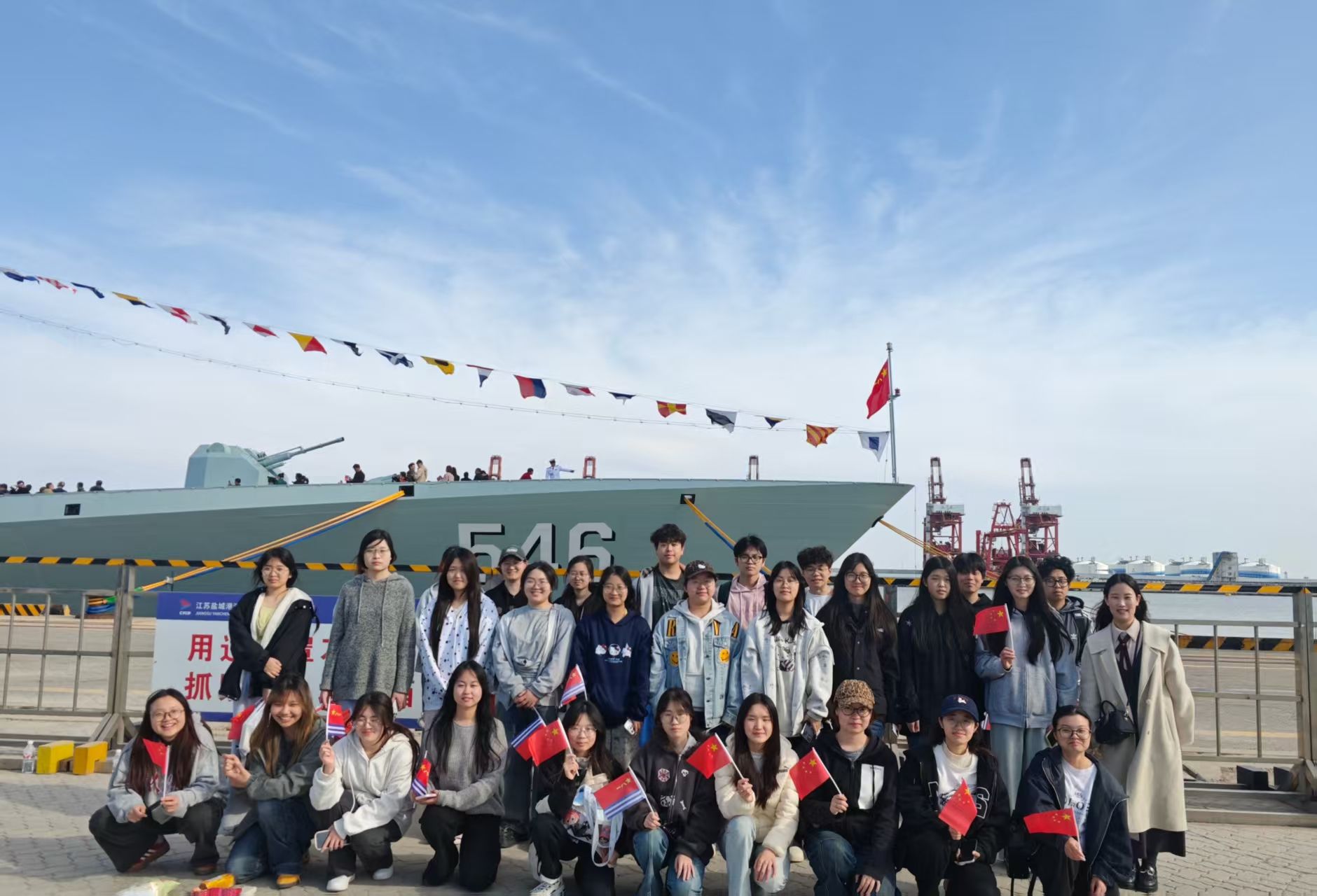 在海军官兵的引导与讲解下,师生依次参观舰艇甲板、武器装备、舰员工作与生活区域,详细了解盐城舰入列以来圆满完成亚丁湾护航、中外联演、叙利亚化武海运护航等70余项重大任务的光辉历程。大家认真聆听、驻足观看,近距离感受大国重器的硬核实力与海军官兵“向海图强、保家卫国”的使命担当,在实景实境中接受了一场深刻的国防教育与精神洗礼。