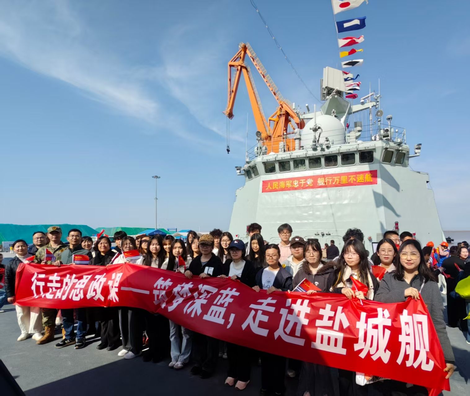 4月23日,正值中国人民海军成立77 周年纪念日之际,马克思主义学院、设计艺术学院近40名师生前往盐城市滨海港码头,登上“盐城舰”开展“行走的思政课——筑梦深蓝,走进盐城舰”主题教学实践活动。活动将思政课堂搬到深蓝战舰之上,让思政教育可感可触、入脑入心。
