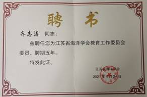 齐志涛教授受聘省海洋学会教育工作委员会委员聘书