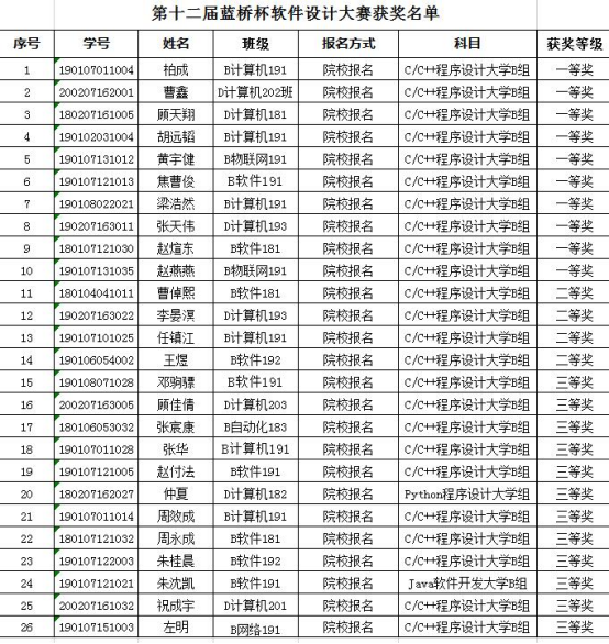 近日,第十二届“蓝桥杯”全国软件和信息技术专业人才大赛个人赛省赛在希望大道校区成功举办。信息学院10名学生获得一等奖,并成功晋级全国总决赛,4人获二等奖,12人获三等奖。