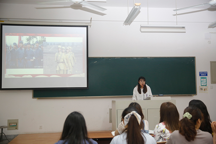 代表小组上台展示的同学,B服装192班刘益同学上台时略显紧张,她说:“我们通过收集研究军服样式、面料、色彩搭配的变化,从侧面认识了中国的国情,学习了共产党的历史,更深切地感受到了人民军队在中国共产党的领导下不断从胜利走向胜利的过程。”汇报后,她表示这堂课锻炼开展调研、语言表达等方面能力,希望以后有更多这样的学习交流机会。