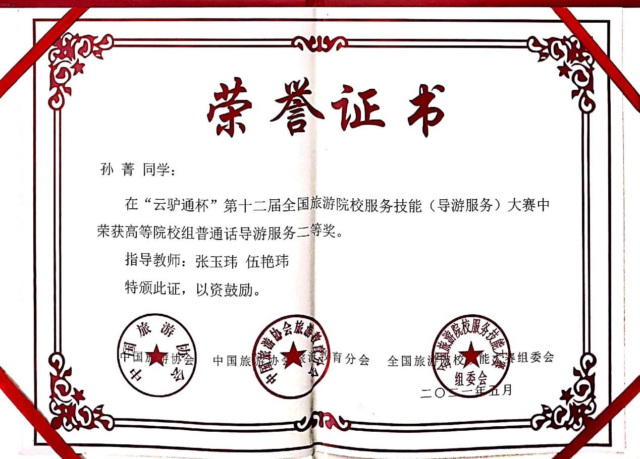 全国旅游院校服务技能(导游服务)大赛由中国旅游协会指导、中国旅游协会旅游教育分会主办。比赛设普通话导游服务和英语导游服务两个项目,每个赛项分别包括理论考核、导游讲解和才艺展示。本届大赛更加突出对接行业需求,增强旅游职业教育适应性,致力于为我国新时代文旅发展战略提供专业人才支撑。