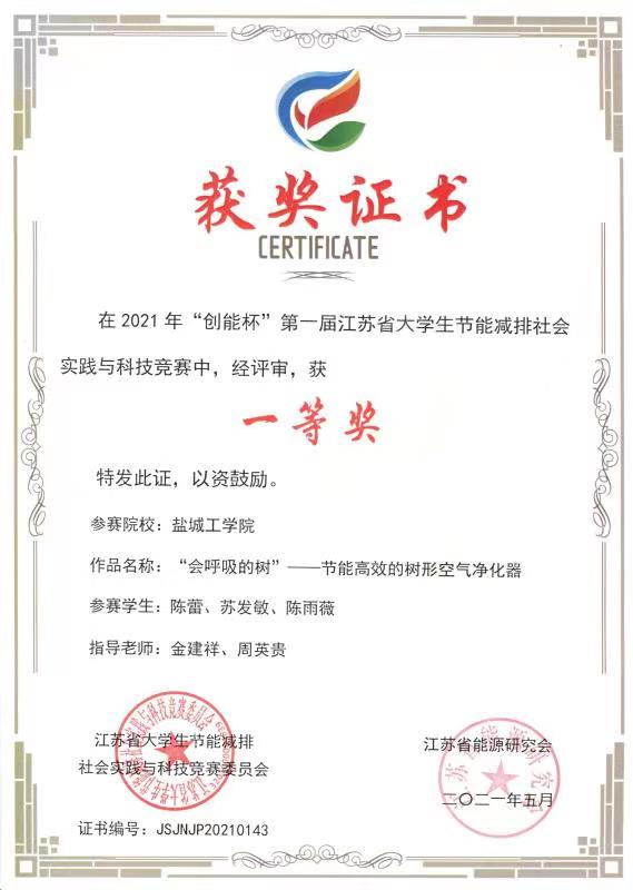 5月15日,由东南大学,江苏省能源研究会主办的第一届江苏省大学生节能减排社会实践与科技竞赛结果揭晓,我校环境学院金建祥、周英贵老师指导,优培学院B理化181陈蕾、环境学院B环设191苏发敏、陈雨薇同学项目《“会呼吸的树”——节能高效的树形空气净化器》入围决赛,并获一等奖;金建祥、翟平老师指导,环境学院B环设192孙红兴、B环境184营中园同学项目《区域水源地保护及市售净水器深度净化调研报告》获三等奖。学校还获得优秀组织奖。