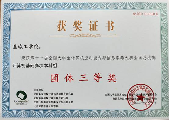 近日,“第十一届全国大学生计算机应用能力与信息素养大赛”全国总决赛在线上进行。经过激烈角逐,在ICT计算机基础大赛项目中,我校获团体三等奖,B物联网192班吴金龙、B机制196班张子茹2位同学获二等奖,D计算机193班左方慧等10人获三等奖,邵洪成等2位老师获二等奖指导教师称号,孙久等10位老师获三等奖指导老师称号。在BAP Office商务应用能力大赛项目中,盐城工学院获团体三等奖,D工管201班邹东旭获一等奖,B计算机191班张华等13人获三等奖,董琴等10位老师获三等奖指导老师称号,盐城工学院获得突出贡献奖。