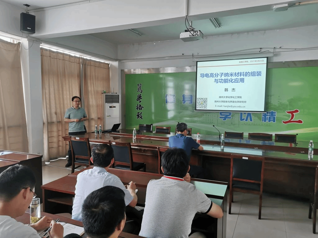 6月22日下午,扬州大学化学化工学院院长韩杰教授应邀来我校作题为“导电高分子纳米材料的组装与功能化应用”的学术报告。报告会由化学化工学院院长奚新国教授主持,化工学院、材料学院相关教师和研究生参加。