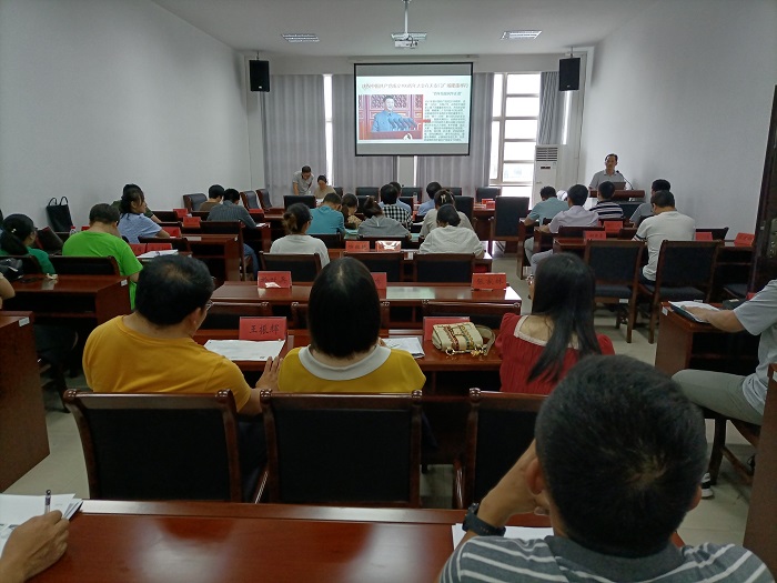 7月7日下午,在南校区润美楼A401会议室,外国语学院党总支书记谷文华为教工支部党员上题为《铭记党史、坚守初心、勇于担当》的党史学习教育专题党课。