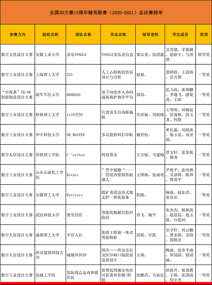 全国3D大赛13周年精英联赛(2020-2021)自2020年9月25日启动以来,全国31个省/直辖市/自治区赛区,大学生组和研究生组共有389所高校,680个院系报名参赛,共提交了5556件初赛作品。2021年4月15日,精英联赛省赛作品提交截止,各赛区、各院校经初赛/校赛、网络海选等方式,共推荐报送省赛团队2953个,作品2953件。经过校赛、省赛层层选拔,我校机械优集学院共提交12项作品,获得江苏赛区特等奖2项,一等奖1项,二等奖5项,三等奖2项。本次全国3D大赛13周年精英联赛(2020-2021)总决赛有近300个团队参与国赛角逐龙鼎大奖。