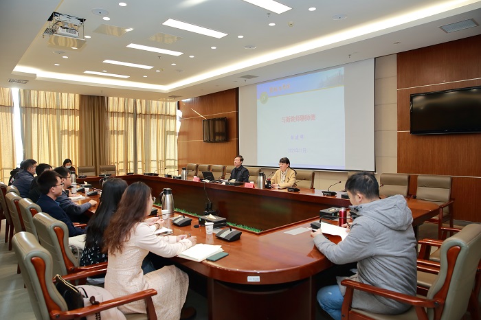 11月11日上午,在南校区行政楼9楼视频会议室,党委教师工作部、教师培训与发展中心邀请原校党委副书记、副校长,校关工委常务副主任,“银龄理论宣讲团(讲师团)”成员张建祥作《与新教师聊师德》专题报告。讲座由党委教师工作部部长、教师培训与发展中心主任沈晓梅主持,2021年入职的全体新教师和党委教师工作部部分工作人员等70余人聆听讲座。