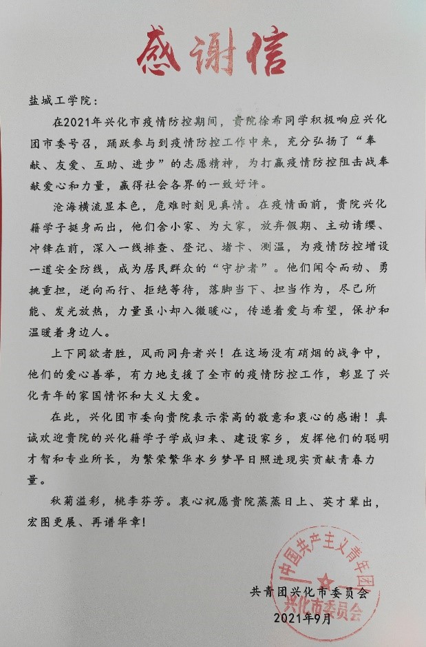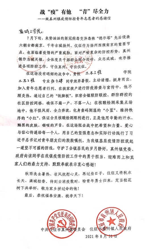 “疫情就是命令,防控就是责任。”近日,盐城工学院土木工程学院党委陆续收到全省各地区、街道和部门寄来感谢信,感谢大学生志愿者在疫情爆发的风险地区,充分弘扬“奉献、友爱、互助、进步”的志愿精神,主动放弃暑期休息时间,放弃与家人团聚机会,面对盛夏烈日,为疫情防控增设一道安全防线,成为居民群众的“守护者”。