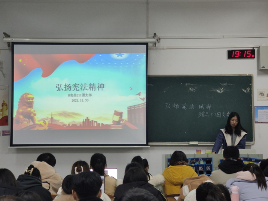 12月1日至3日晚上,学生们或在宿舍、或在教室、或在图书馆,手机、电脑等各种移动设备齐上阵,从经济、教育、医疗等多个方面进一步了解宪法条例,沐浴宪法力量,感受宪法阳光;12月1日下午,在学院会议室举办“维护宪法尊严,履行宪法义务”主题讲座,团委副书记王珂通过解读宪法、视频科普等方式,引导学生认真学习宪法,牢记宪法使命,维护宪法尊严,履行宪法义务,新生代表80余人参与。