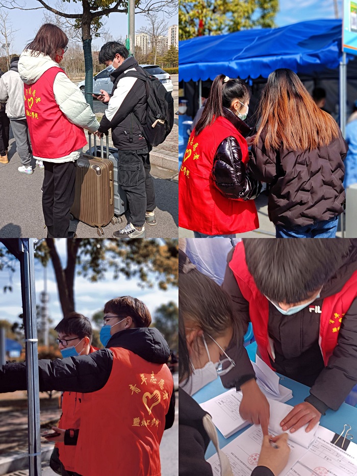 为保障疫情期间学生返校工作顺利开展,在学校统一安排部署下,我校团委面向全校青年志愿者发出号召,提前招募、认真培训,在返校服务现场筑起“青春防线”。2022年春学期返校工作中,我校100余名学生志愿者勇敢地站在校园防“疫”第一线,为其他同学顺利返校保驾护航。检测体温,核查苏康码、行程卡、核酸检测证明,检查返校证明,扫描盐工健康码,发放健康证明,24小时夜班值守……志愿者们认真做好每一项工作,用实际行动展现盐粒子志愿者的责任与担当。