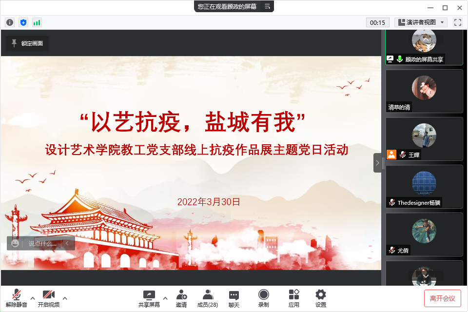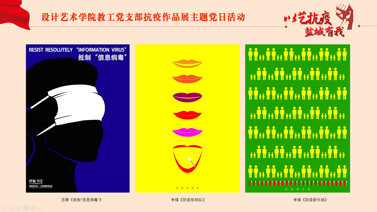 为进一步弘扬“生命至上,举国同心,舍生忘死,尊重科学,命运与共”的伟大抗疫精神,落实上级有关抗疫文件要求,助力开展防疫宣传工作,3月30日下午,设计艺术学院教工党支部在网络云端举行“以艺抗疫,盐城有我”抗疫作品展主题党日活动。活动由党支部书记钱峰主持,支部全体党员参加。