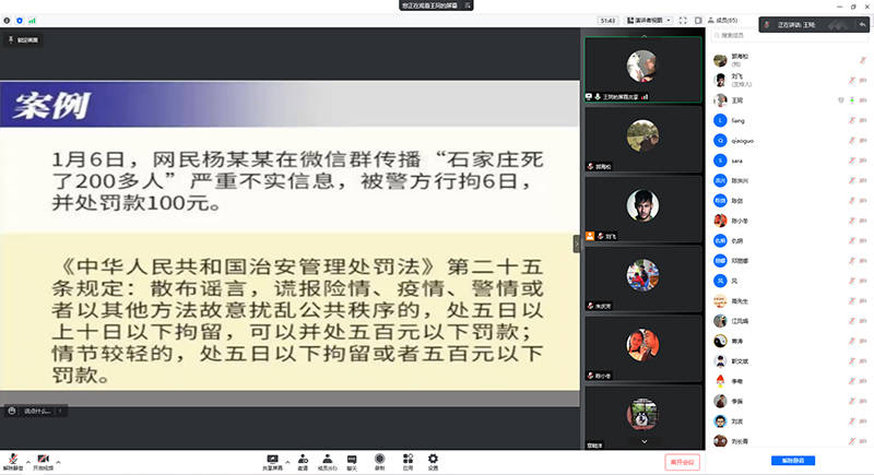3月30日下午,学院利用政治学习时间组织线上、线下疫情防控法律知识“微讲座”,学院全体教师与学生干部聆听。团委副书记王珂以腾讯会议形式,以案释法,带领大家学习了《刑法》《传染病防治法》《突发事件应对法》《治安管理处罚法》的主要内容,并以疫情防控期间发生的“隐瞒行程”“散布谣言”“伪造检测报告”“殴打抗疫人员”“拒绝隔离”“辱骂防疫人员”等受到相关法律处罚的6个真实案例,引导全体师生深入了解疫情防控工作有关的法律知识,进一步提高依法防控的意识,助力校园常态化疫情防控。