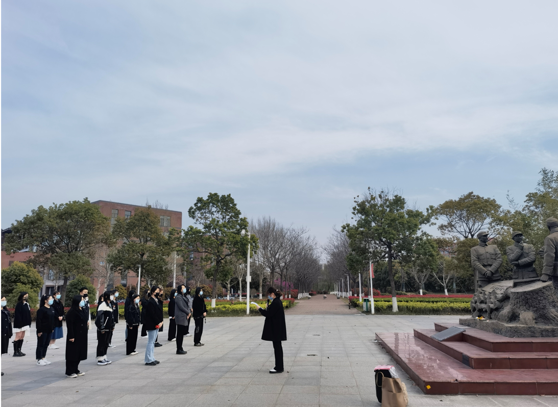 活动开始,全体肃立,向革命先烈默哀一分钟。学生党员们通过瞻仰铁军广场纪念碑与重温入党誓词等方式,缅怀革命先烈、表达对革命先烈的哀思。学生党员代表B英语181班茅妤婷同志表态发言:“我们的烈士们,他们的肉体虽已逝去,但他们那可贵的、崇高的精神却像一团巨火燃烧着,永不熄灭……我们将永远铭记和颂扬革命先烈的事迹,继承先烈的遗志,用自己的生命和才智去实现先烈们未尽的共产主义事业,去创造共和国无限美好的明天,为共产主义事业奋斗终生!”预备党员代表B英语192班林嘉惠同志向大家介绍铁军广场“青松傲雪”雕像的由来,并带领全体学生党员一同学习革命烈士英勇事迹。她表示:“在战争中形成的‘铁军精神’,是历史馈赠盐阜人民的精神遗产,也是盐城工学院的宝贵财富!”