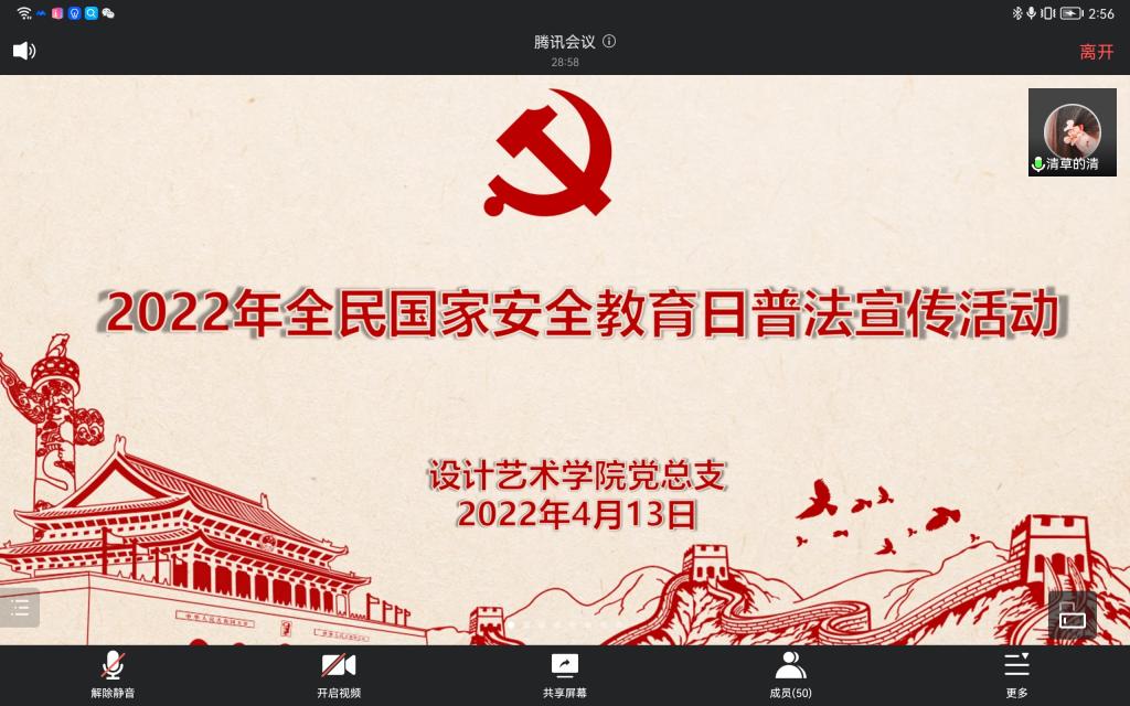 4月13日下午,设计艺术学院线上举行教职工政治理论学习会,围绕4·15全民国家安全教育日开展专题学习。院党总支书记胡凌霞主持,副院长王文广和学工办副主任顾清作领学发言,学院全体教职工在线参加学习会。