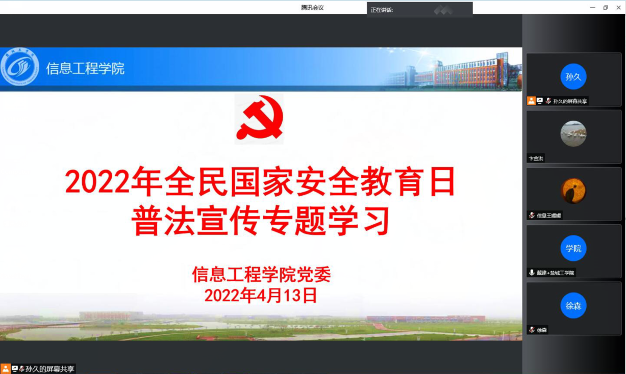为深入开展安全法治宣传教育,增强信息学院师生安全意识和法治意识,4月13日下午,信息学院组织开展全民国家安全教育日专题学习活动。学习活动由学院党委书记王爱军主持,学院全体教职工采用线上方式参加学习活动。