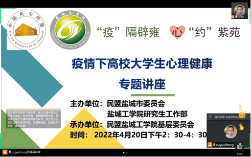 为进一步加强疫情期间在校大学生的心理健康教育,帮助我校学生做好疫情期间的心理调适,缓解同学们的心理压力和焦虑情绪,切实保障疫情期间学生的身心健康。4月20日下午,由民盟盐城市委、盐城工学院研究生院主办,民盟盐城工学院基层委员会承办的“‘疫’隔辟雍,心‘约’紫苑——疫情下高校大学生心理健康专题讲座”成功举办。活动由盐城工学院研究生院副院长、民盟盐城市委副主委徐桂中主持。