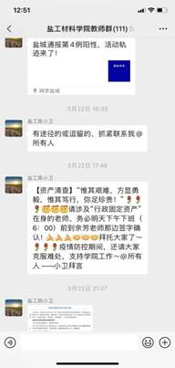 与生共处,全天守护。学工办主任郭群娜克服家庭困难,先生在盐城东台工作,宝宝才4岁,进驻学校每天细心做好每一位学生防控信息排查、统计和上报工作,督促广大学生完成日常健康打卡,严格落实“日报告”和“零报告”,跟踪每一位学生健康状况。辅导员周志峰老师直接住在学生宿舍,坚持“信息化”“网格化”“携手化”战役模式,及时排查、统计信息,多次陪护学生外出转诊就医。“躲过了两个城市的异地恋,没想到同一个城市也要异地分居啦!”袁梅、高姗两位老师,新婚不久,她们舍小家,为大家,经过连续多日24小时与学生朝夕相伴,让她们对辅导员岗位又有了新的、更深入的体会和认知;党政办公室副主任陈小卫,只要接到上级文件、工作指令,都在第一时间向老师们传达,及时跟踪督导、报告反馈。