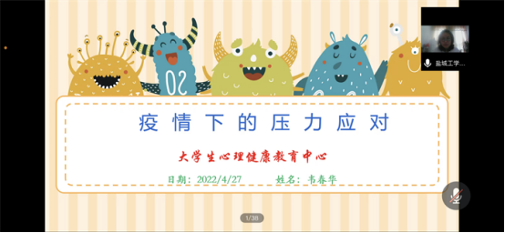 为扎实落实学校疫情防控政策,引导学生以正确的心态应对疫情,学会疫情期间心理调适方法,有针对性地进行防疫心理疏导,提升学生心理素质,守护学生生命安全。4月27日下午,人文学院邀请学校心理健康教育中心主任韦春华面向大一、大二、大三年级学生代表、心理委员共300人开展了以“疫情下的压力面对”为主题的线上心理健康教育讲座。讲座由人文学院党总支副书记姚爱华主持。
