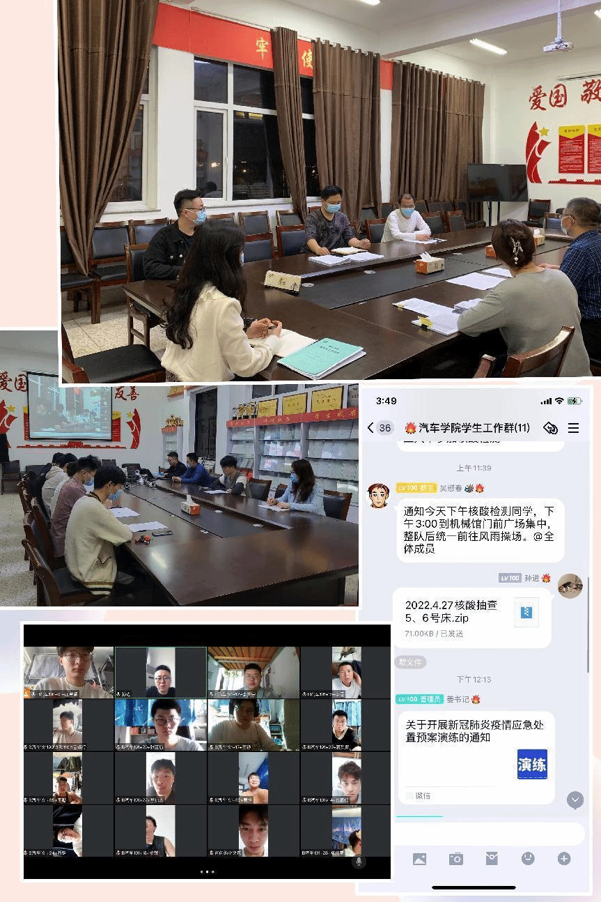 汽车工程学院党总支切实发挥二级学院战斗堡垒作用,每日召开疫情防控领导小组会议,统一思想,夯实责任,研究部署防控工作,对学院师生疫情防控教育管理以及线上教学工作等方面做了精准安排部署。为切实提高师生应对疫情突发状况应急处置能力,学院组织开展疫情防控应急处置演练。演练过程严格按照学校疫情防控突发事件应急处置规定的流程进行,达到了明确程序环节、明确责任分工、明确处置规范的目的,提高了师生应对疫情突发事件的处置能力。