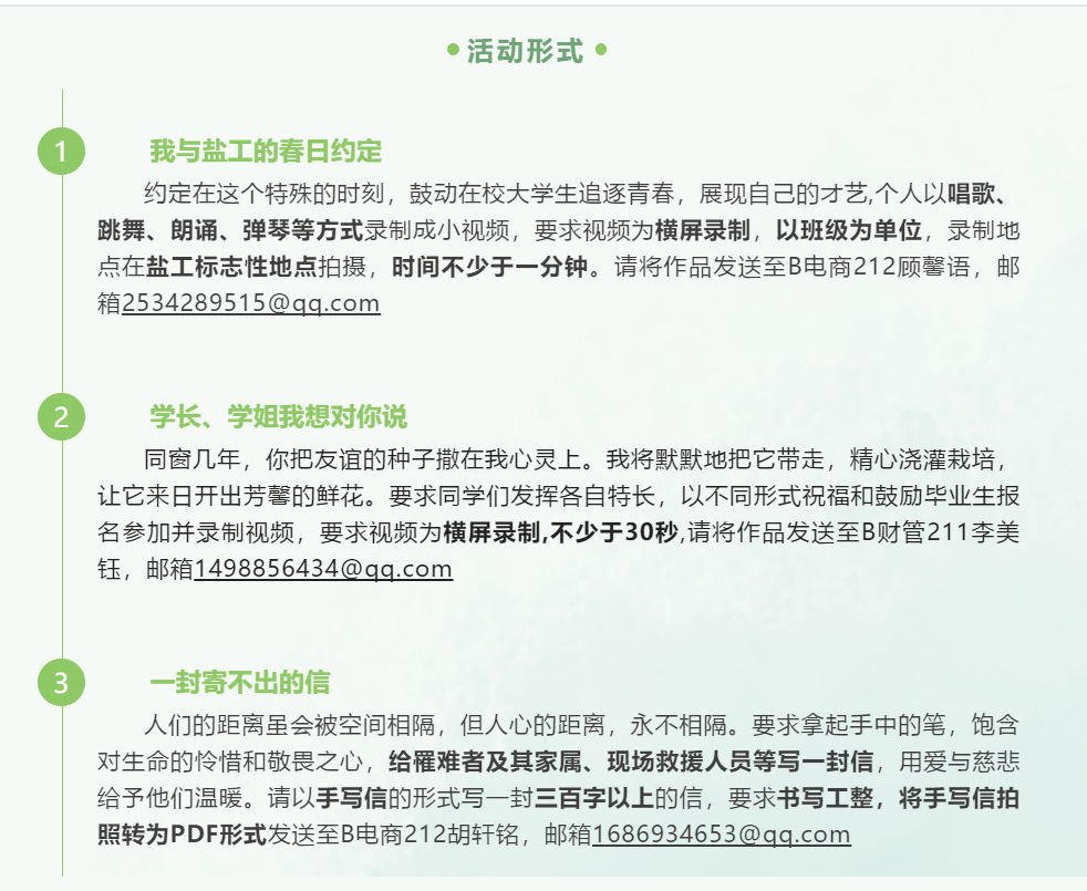 携手抗“疫”,共盼春来。在校园疫情防控工作常态化形势下,为了让在校学生放松身心,强身健体,经管学院特此开展“携手抗‘疫’,共盼春来”系列主题实践活动,活动形式共分为六种,内容丰富,奖励多多,在这个充满着盎然与悸动的春天,同学们尽情展现自己的才艺,让盐工的春意愈浓,使冬日的寒冷驱散。