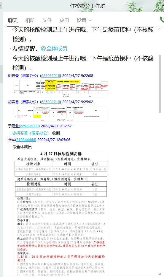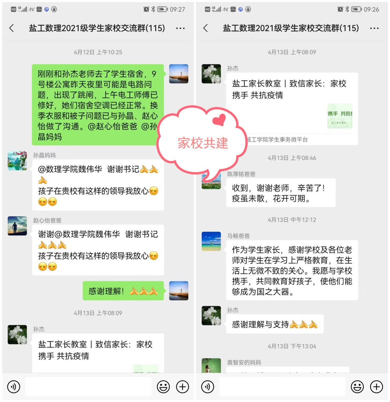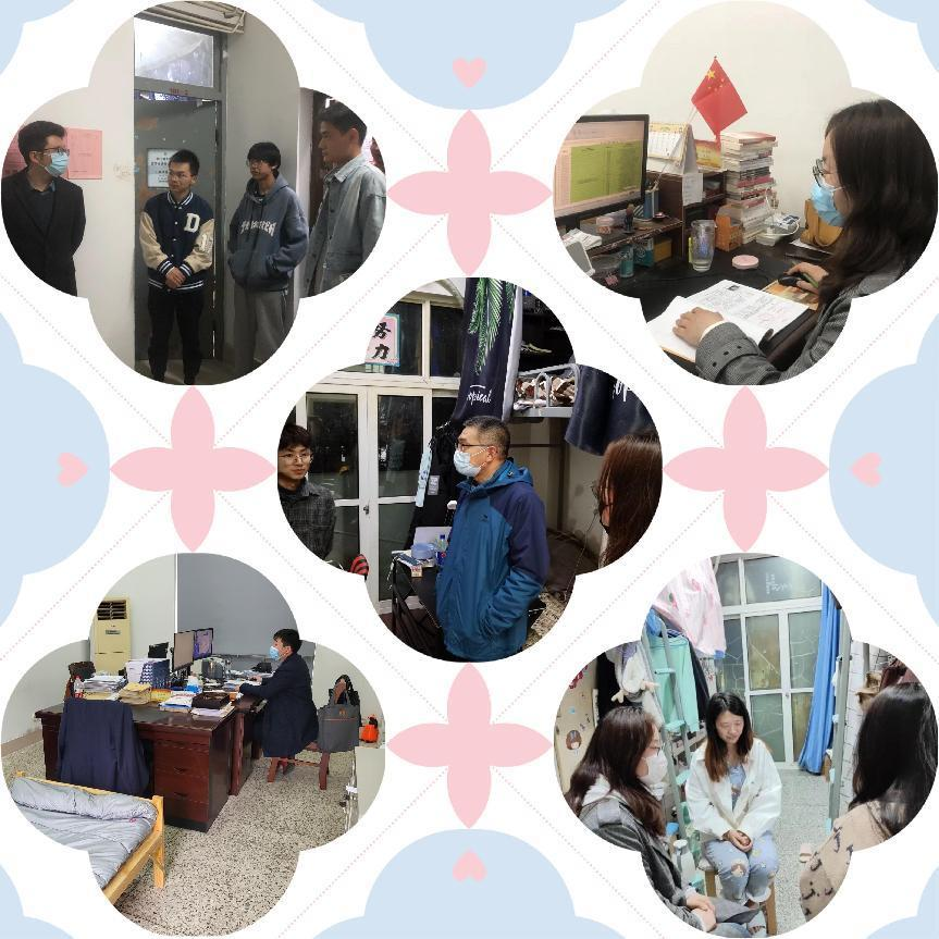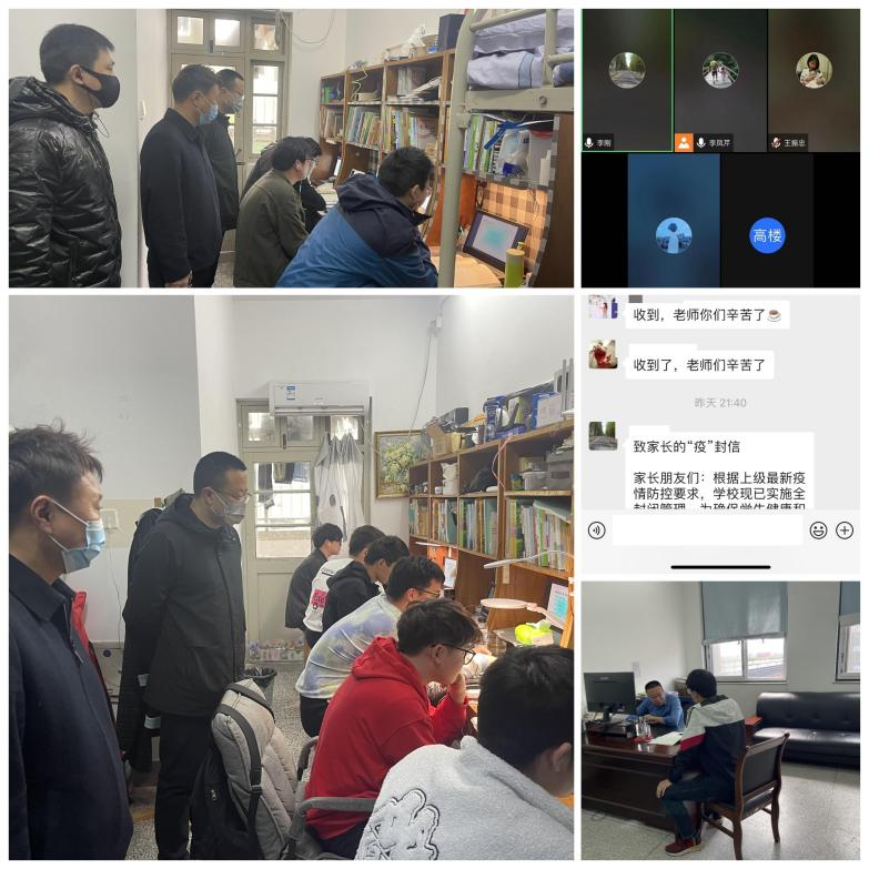 学院党政领导深入学生宿舍,了解学生的情况,为学生排忧解难,积极向学校相关部门反馈,解决学生的实际困难。4月11日,学校进入封闭管理,“不进不出”,学院党政领导带头响应,舍小家顾大家,进驻学校以后,与学生一对一进行谈话,指导学生的学业规划,与同学们共克时艰。儿行千里母担忧,每个孩子都是家庭无尽的牵挂,学校封闭管理,筑牢了疫情防控的防线,为了缓解家长的担忧,通过家长群及时将学校的疫情防控相关通知告知家长,在赢得家长理解的同时,形成家校合力,助力疫情防控。